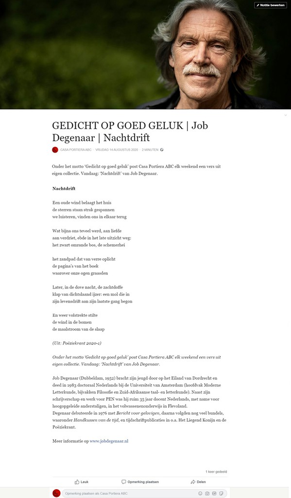 In het mooie historische stadje Aardenburg in Zeeuws-Vlaanderen heeft stadsdichter en veelzijdig kunstenaar Rogier de Jong een boekhandel annex galerie met beeldentuin annex B&B, Casa Portiera genaamd. Voor zijn Facebookpagina kiest hij wekelijks een gedicht onder de rubriek 'Op goed geluk'. Op 14 augustus mocht Degenaar zich opgenomen weten in het Aardenburgse.