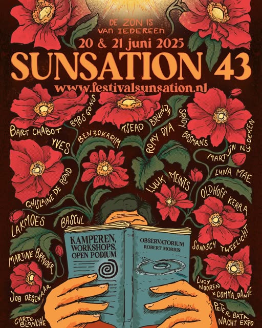 De volledige line-up van poëziefestival Sunsation is bekend. Dichter der Nederlanden Babs Gons en schrijver en dichter Bart Chabot zijn de hoofdgasten van het poëziefestival. Sunsation vindt ieder jaar plaat rondom de langste dag van het jaar, in en rondom het landschapskunstwerk ‘Observatorium’ van Robert Morris, bij Lelystad. De festivalposter, ontworpen door Urker kunstenaar Pieter Brouwer, werd donderdagavond 5 juni 2025 gepresenteerd in denieuwebibliotheek in Almere. De 43e editie van het festival draagt de slogan: ‘de zon is van iedereen’: Sunsation is een festival voor een zo breed mogelijk publiek, dat bovendien gratis toegankelijk is.