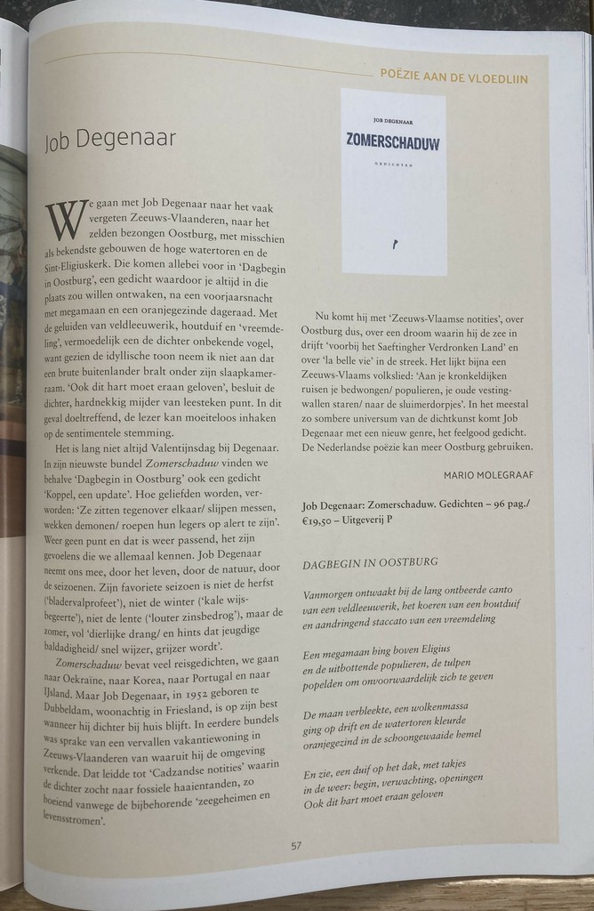 Nu komt hij met ‘Zeeuws-Vlaamse notities’, over Oostburg dus, over een droom waarin hij de zee in drijft ‘voorbij het Saeftinger Verdronken Land’ en over ‘la belle vie’ in de streek. Het lijkt bijna een Zeeuws-Vlaams volkslied: ‘Aan je kronkeldijken ruisen je bedwongen/ populieren, je oude vestingwallen staren/ naar de sluimerdorpjes’. In het meestal zo sombere universum van de dichtkunst komt Job Degenaar met een nieuw genre, het feelgood gedicht. De Nederlandse poëzie kan meer Oostburg gebruiken.