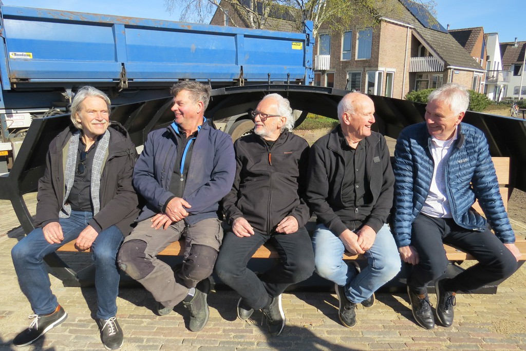 Met een vrachtwagen kwam het kunstwerk dinsdag aan op de plek van bestemming en werd vervolgens op zijn ondergrond gehesen. Precisiewerk voor de vrijwillige makers van de Akenbank, die zich in alle bochten wrongen om het mooie gevaarte zo op hun plek te krijgen. In het hele proces had de 80-jarige Rein van den Berg als scheepsbouwer de regie, geholpen door Johan Bijlholt en Johan Verschoor. Henk van den Berg leverde de planken en ook hij hielp in de voorbereiding van de plaatsing. Rein:” Moai om dit foar De Lemmer te dwaan. En we ha ek in soad wille hân.”