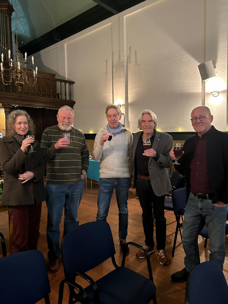 Op de foto: Rinny Koornstra (kunstenares, coverontwerpster), Anne Stins, Henk de Jonge, Job Degenaar en Jan Sibbel.