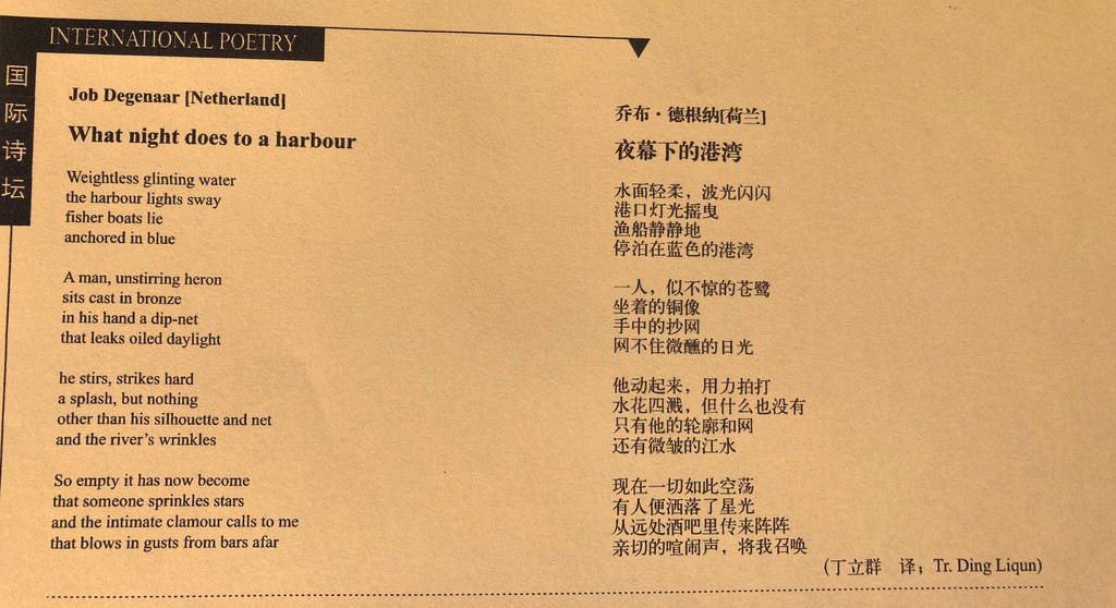 In het februari-nummer van Rendition International Poetry Quarterly, nr. 109, is het oorspronkelijk Nederlandstalige gedicht 'Wat avond met een haven doet' (uit Vluchtgegevens, 2011)' in het Chinees overgezet door Ding Liqun.